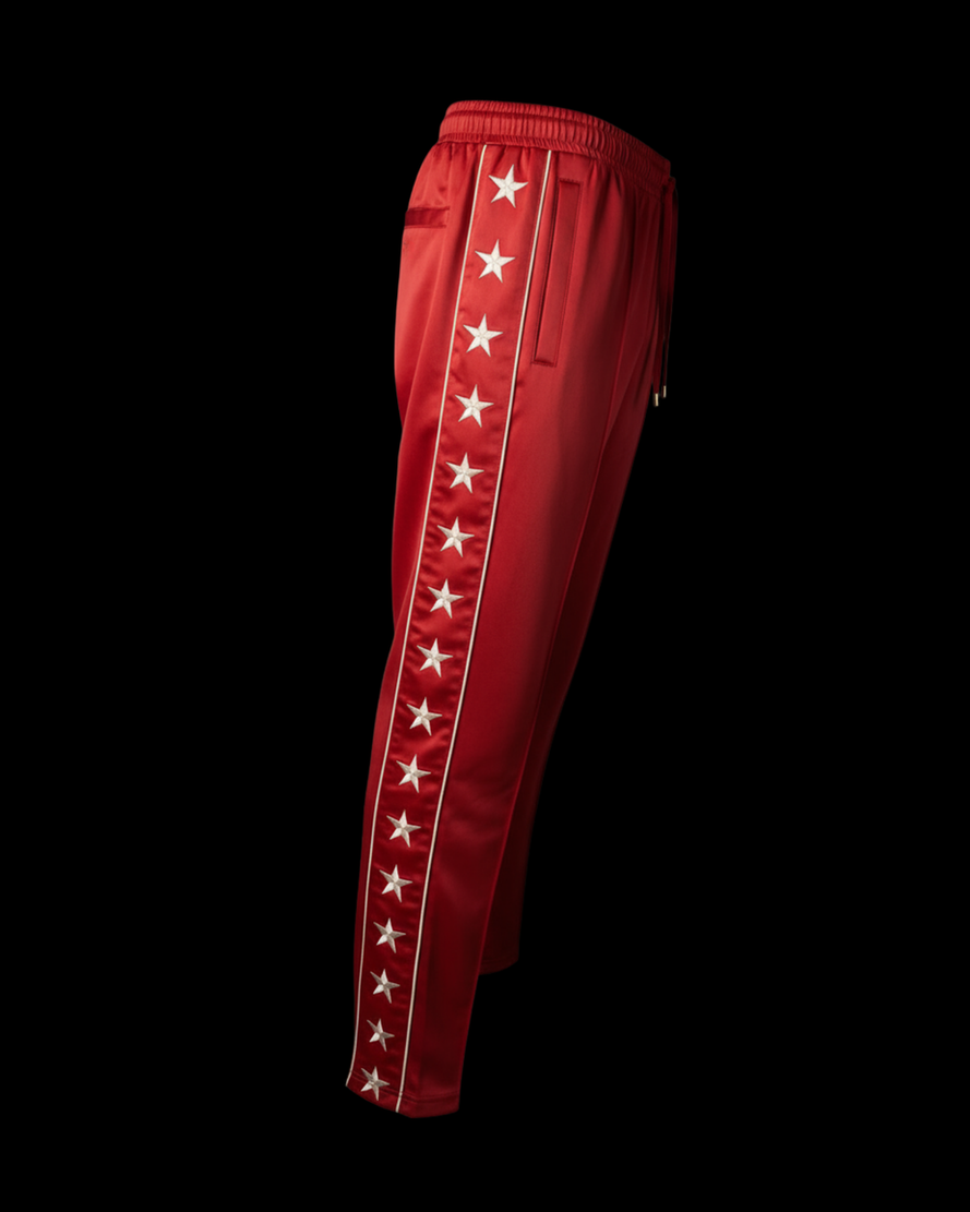 L'icône en mouvement. Le pantalon de survêtement AREDO Star incarne l'ADN du retour de POGBA MDX dans une silhouette luxueuse : un corps en satin élégant, des empiècements latéraux blanc cassé brodés d'étoiles et un cordon de serrage à embouts métalliques conçu pour les victoires quotidiennes. Épuré, fuselé et conçu pour passer de l'entraînement aux soirées citadines.