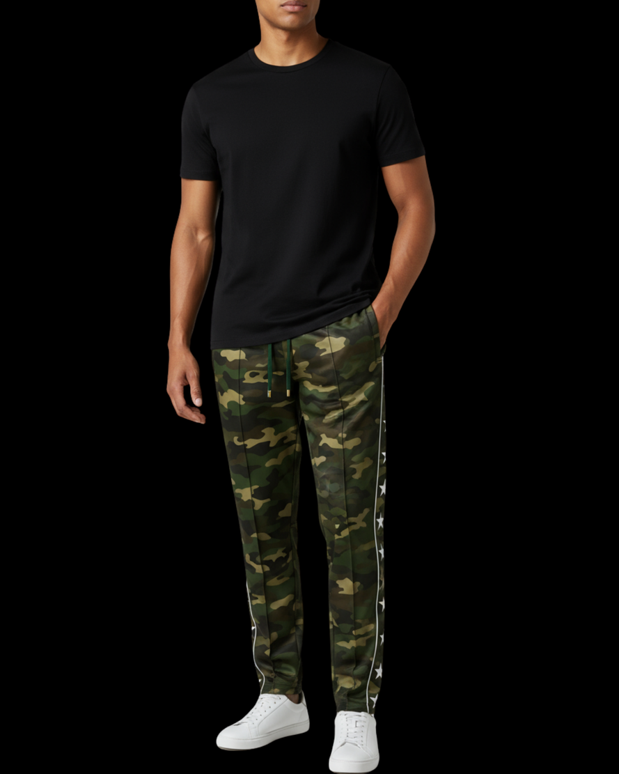 Built for bold moves. The AKA93 Star-Stripe Track Pant merges deep camo satin with crisp white star tape and contrast piping—true POGBA MDX DNA that turns tunnel energy into everyday statement wear.