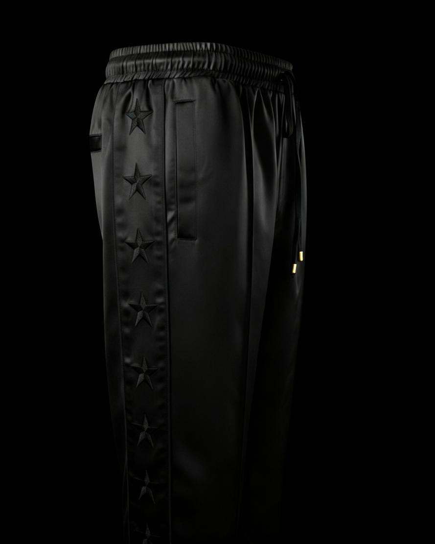 The icon in motion. The AMASI Star-Stripe Track Pant goes full stealth—deep black satin with tonal black embroidered star tape and a clean pintuck line. Texture over noise, built for comebacks, arrivals, and late-night wins—unmistakably POGBA MDX.
