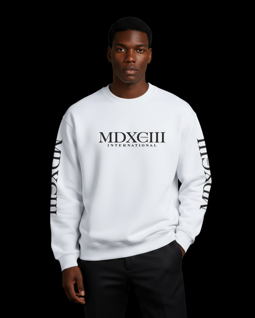 The MDX International Crewneck carries a bold chest wordmark with matching sleeve hits that read MDXCIII—calm authority you can feel, built for travel days, training blocks, and every quiet rep that stacks into results.